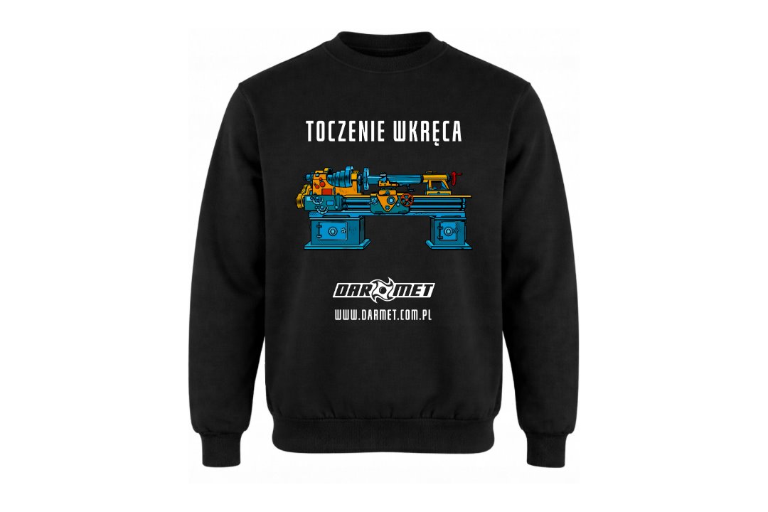 - Bluza czarna bez kaptura unikatową grafiką przedstawiającą tokarkę w stylu retro oraz hasłem "Toczenie wkręca". Na karku logo "Darmet".