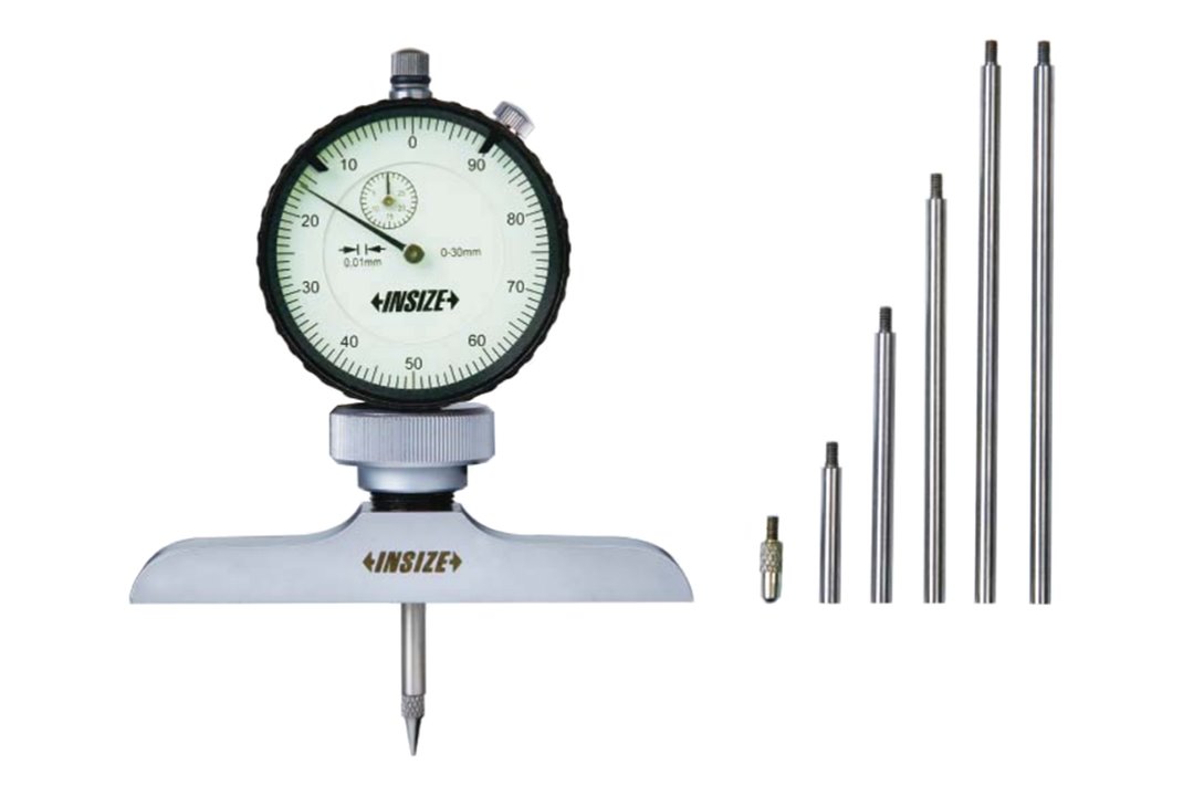 Głębokościomierz zegarowy 0-300 mm, igłowy, rozdzielczość 0,01 mm, baza 63 x 17 mm, dwie końcówki pomiarowe, wymienne adaptery końcówek - INSIZE 2342-201