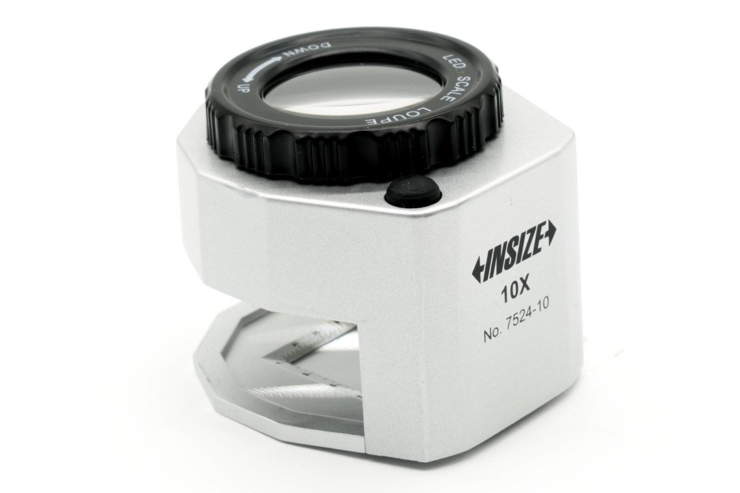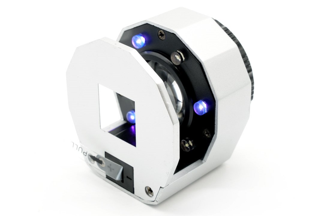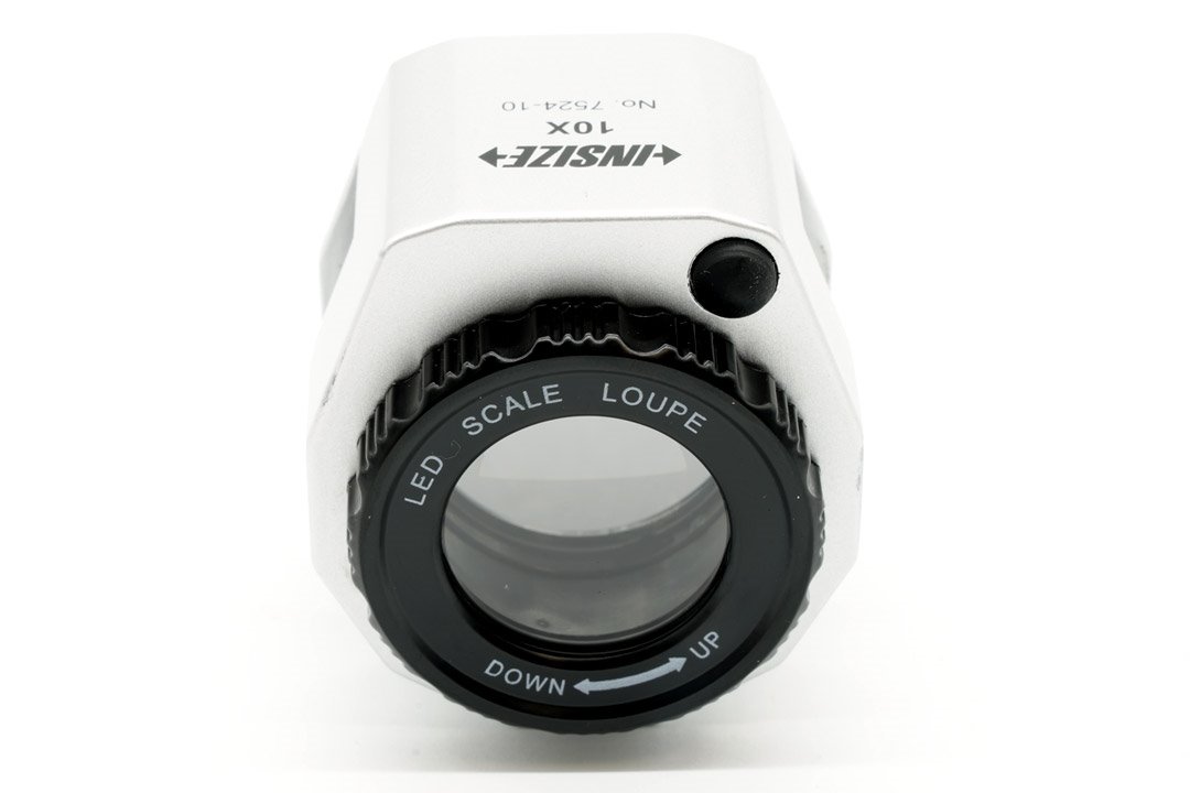 - Aktywne oświetlenie 3× dioda biała LED i 3× dioda UV (włączane oddzielnie) oraz podstawkę ze skalą (0,5 mm / 1/16″) ułatwiającą pomiar i orientację.