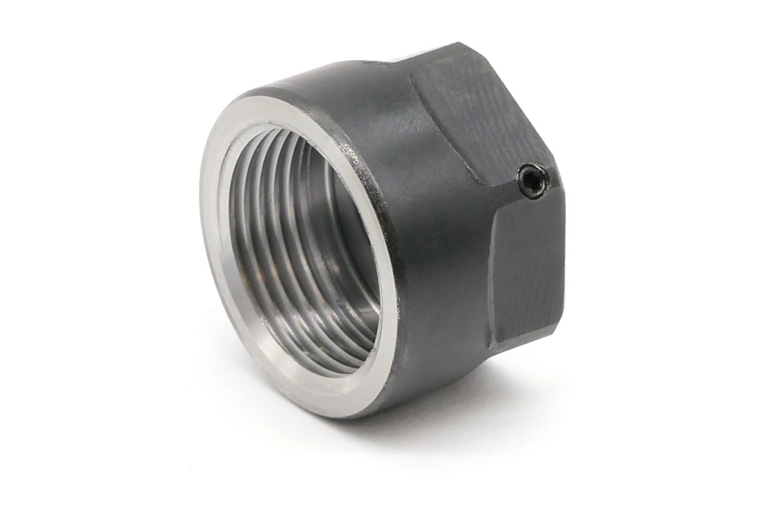 - Nakrętkę z wciśniętą tulejką skręcić z oprawką, tak aby możliwe było zamocowanie obrabianego narzędzia.