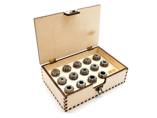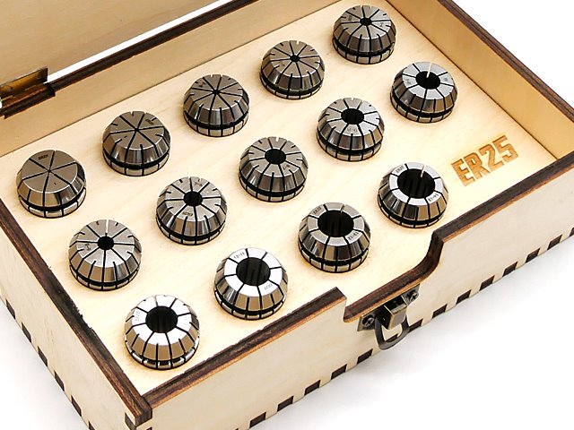 - W pudełku skompletowane zostały standardowe tulejki zaciskowe ER25 w rozmiarach: