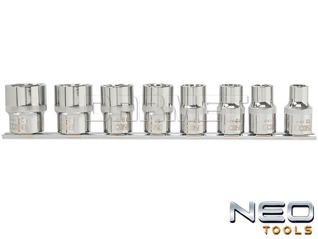 - Nasadki Spline długie 1/2" NEO w zestawie 8 sztuk w popularnych rozmiarach (od 10 do 24 mm)
