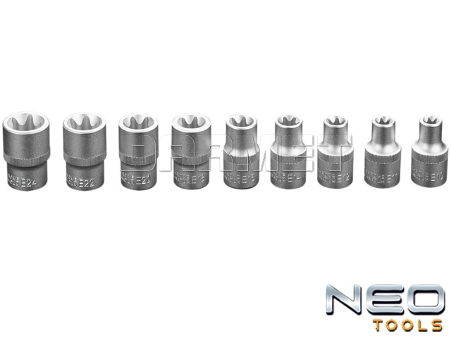 - Zestaw składa się z 9 szt. wysokiej jakości nasadek Torx w rozmiarach od E10 do E24