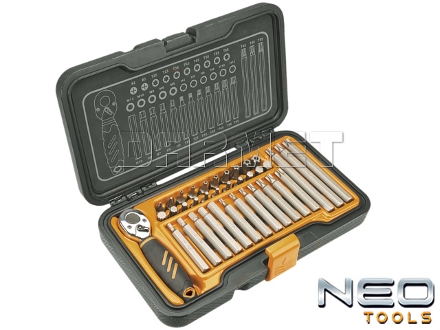 - Zestaw końcówek wkrętakowych NEO 1/4", składający się z 37 elementów